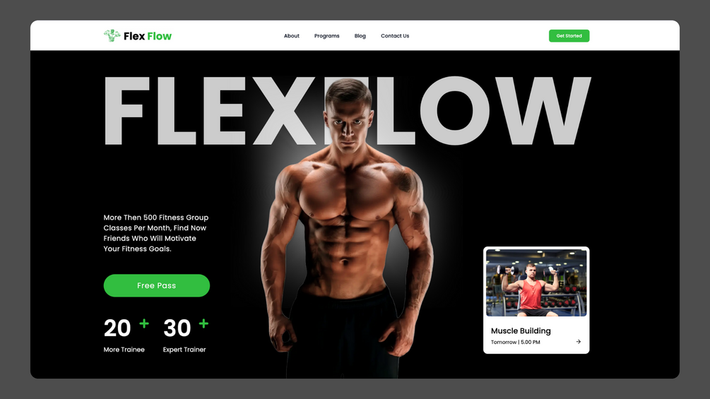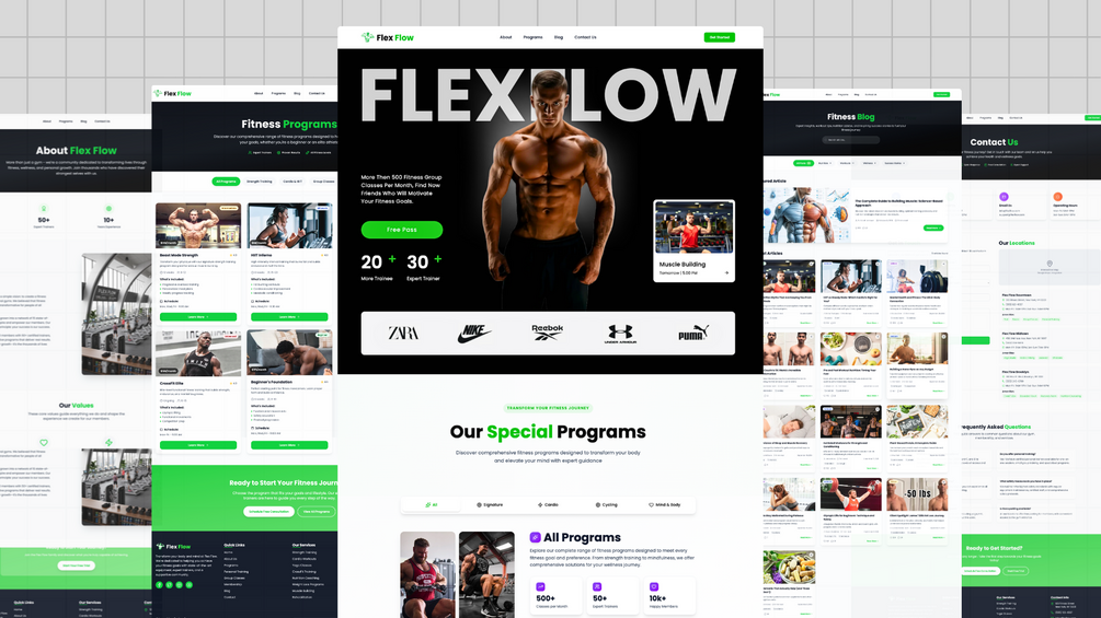 Flex Flow — a fully production-ready fitness website using Next.js 15, React 18, Tailwind CSS, Shadcn UI, Lucide Icons, and AOS Animation.